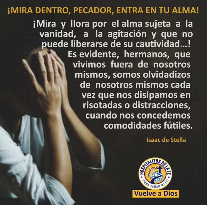 ¡Mira dentro, pecador, entra en tu alma! ¡Mira y llora por el alma sujeta a la vanidad, a la agitación y que no puede liberarse de su cautividad…! Es evidente, hermanos, que vivimos fuera de nosotros mismos; somos olvidadizos de nosotros mismos cada vez que nos disipamos en risotadas o distracciones, cuando nos concedemos comodidades fútiles. Por esto, la Sabiduría tiene interés en invitarnos a la casa del arrepentimiento más que a la casa de la diversión, es decir, llamar al hombre mismo desde dentro de sí, diciendo: “Dichosos los que lloran”, y en otro pasaje: “Ay de los que reís ahora”.