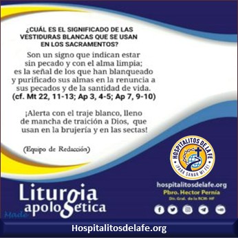 Vemos con claridad, entonces, que el blanco de las vestiduras es un signo externo que representa el alma del hombre, y que nos ayuda a recordar y animarnos a alejarnos del pecado para permanecer siempre en gracia de Dios. En cambio, en religiones como la mal llamada “santería”, o en varias sectas que se auto proclaman “cristianas”, usan este color para evitar que las personas vean el pecado de la apostasía y la traición a Dios a la que están siendo arrastrados bajo engaño, y hacerles creer, por el contrario, que ahora sí le están entregando su vida a Dios, y que todo lo que había creído como católico había sido sólo un engaño.