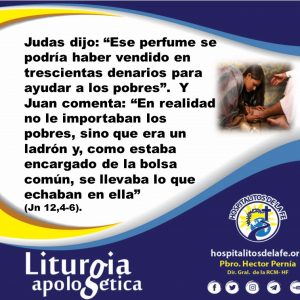 Bien cabe, en algunos casos, decir a muchas de éstas personas lo mismo que Juan comenta de Judas Iscariote cuando murmuraba al ver que una mujer pecadora derramaba un costoso perfume en los pies de Jesús y se los secaba con sus cabellos. Judas dijo: “Ese perfume se podría haber vendido en trescientas denarios para ayudar a los pobres”. Y Juan comenta: “En realidad no le importaban los pobres, sino que era un ladrón y, como estaba encargado de la bolsa común, se llevaba lo que echaban en ella” (Jn 12,4-6).