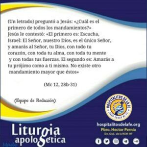 El P. Pernía me recuerda que en la 1ª lectura y el Evangelio hay quienes plantean que hay “un solo Dios”, para negar la figura trinitaria del Dios-Padre, el Dios-Hijo y el Dios-Espíritu Santo. Esta postura responde a la doctrina mormona, definiendo que las tres personas, son cada una un Dios por separado, y que también las personas, una vez que se casan se convierten en dioses para toda la eternidad. Ésta, es una asunción errónea del Dios uno y Trino de la Fe católica que será desarrollada posteriormente. Es triste observar la soledad y tristeza de las personas que dicen o se sienten carentes de amor; de las que son agresivas, egoístas, desconfiadas y testaduras. Pido por los ateos o agnósticos que defienden su modo de ser y se niegan ver más allá de lo que tienen enfrente. De igual manera, los cismas habidos en la Iglesia hace 5 siglos han generado posturas disociativas que se basaron de la Sola Fides de Lutero, metodistas y sucesivos reduccionismos de la Fe por los hermanos esperados, al basarse de manera unilateral a la Sola Scriptura.