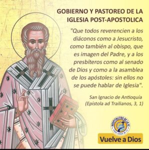 Que todos reverencien a los diáconos como a Jesucristo, como también al obispo, que es imagen del Padre, y a los presbíteros como al senado de Dios y como a la asamblea de los apóstoles: sin ellos no se puede hablar de Iglesia (San Ignacio de Antioquía, Epístola ad Trailianos, 3, 1).