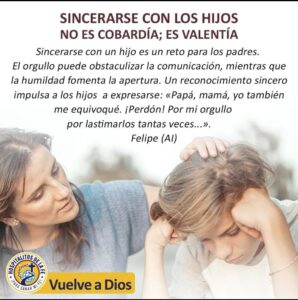 Sincerarse con un hijo puede ser un desafío para los padres, quienes a menudo encuentran dificultades para abrir su corazón por completo. Los adultos suelen tener temor y bloqueo para intimar con sus hijos; les resulta complicado mostrar vulnerabilidad y vulnerar su propio orgullo. El orgullo de los padres alimenta el de los hijos, mientras que la humildad fomenta su apertura. Con un reconocimiento sincero, los hijos pueden sentir el impulso necesario para también expresarse: «Papá, mamá; yo también me equivoqué. ¡Perdón! Por mi orgullo y por lastimarlos tantas veces con mi indiferencia. Yo también los amo, pero no sabía cómo decírselo».
