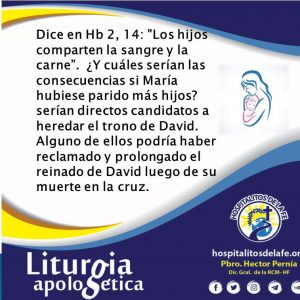 Dice en Hb 2, 14: «Los hijos comparten la sangre y la carne”. ¿Y cuáles serían las consecuencias si María hubiese parido más hijos? Ellos llevarían en sus venas la misma sangre de Cristo por haber nacido del mismo vientre de donde Él nació; y tendrían toda legitimidad, derecho y justificación de apelar a que también tenían sangre redentora, salvadora y de Mesías. Teniendo ellos, el mismo linaje y la misma sangre del Rey de Reyes, serían directos candidatos a heredar el trono de David. Podrían, muy bien, haber apelado a que tenían sangre divina en sus venas y nosotros estaríamos obligados a rendirles la misma adoración y gloria que a Jesucristo. Alguno de ellos podría haber reclamado y prolongado el reinado de David luego de su muerte en la cruz.