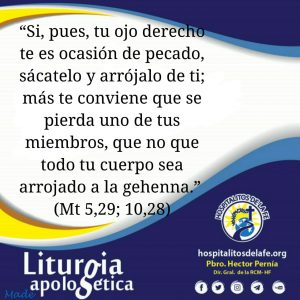 “Y si tu pie te es ocasión de pecado, córtatelo. Más vale que entres cojo en la Vida que, con los dos pies, ser arrojado a la gehenna. Donde su gusano no muere y el fuego no se apaga. Y si tu ojo te es ocasión de pecado, sácatelo. Más vale que entres con un solo ojo en el Reino de Dios que, con los dos ojos, ser arrojado a la gehenna, donde su gusano no muere y el fuego no se apaga; pues todos han de ser salados con fuego.” (Mc 9,45-49)