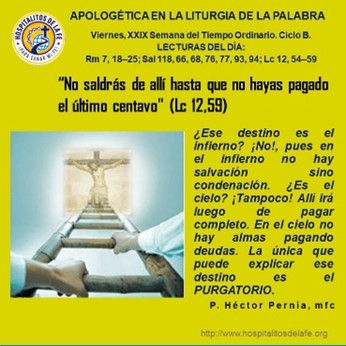El evangelio nos abre una ventana para encontrar la presencia de la doctrina sobre el Purgatorio, y comienza desde donde el Señor nos dice: «De camino a las autoridades con tu adversario, aprovecha y reconcíliate con él» (Lc 12, 58); de otro modo, al partir de este mundo, si nos vamos con deudas pendientes, tendremos que dar cuentas de ellas, y por eso nos anuncia: «Yo te aseguro que no saldrás de allí hasta que no hayas pagado el último centavo» (Lc 12,59).
