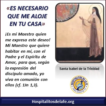”«Es necesario que me aloje en tu casa.» ¡Es mi Maestro quien me expresa este deseo! Mi Maestro que quiere habitar en mí, con el Padre y el Espíritu de Amor, para que, según la expresión del discípulo amado, yo viva en comunión con ellos (1Jn 1,3). «Ya no sois extranjeros ni forasteros, sino que sois miembros de la casa de Dios», dice San Pablo (Ef 2,19). He aquí como yo entiendo ser «de la casa de Dios»: viviendo en el seno de la apacible Trinidad, en mi abismo interior, en esta «fortaleza inexpugnable del santo recogimiento» de la cual habla San Juan de la Cruz.” (1)