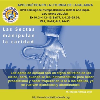Son muchos los católicos que quedan atrapados y seducidos por las sectas cuando las ven repartiendo comida a los más necesitados, atendiendo drogadictos, resolviendo necesidades económicas o de salud de la población. Creen, que, ya con eso, tienen la credencial de ser pastores de Dios y verdaderas iglesias del Señor. Y entonces, critican a los católicos de su comunidad porque no hacen esas cosas.