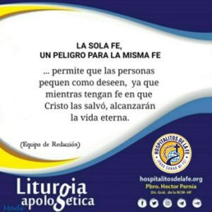 Es la creencia de que estamos salvados ÚNICAMENTE por nuestra fe en Jesucristo, y que, como la salvación viene sólo por la fe, no estamos obligados a las obras buenas, o, como mínimo, no representan nada para salvarnos. En otras palabras, perfectamente podemos faltar a la caridad – por ejemplo abandonando al prójimo en su sufrimiento – y aún así salvarnos. Quienes creen en la sola fe no luchan contra el mal, sino que se combate con fuerza a quienes tratan de oponérsele.